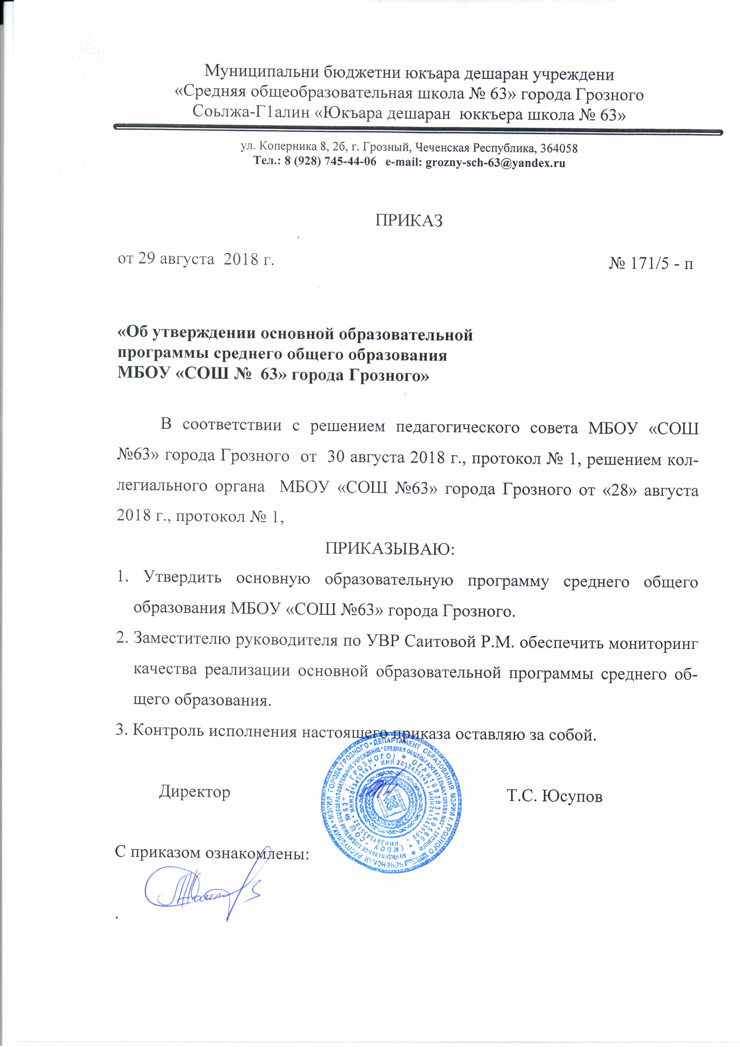 Приказ №40/3-п от 29 августа 2017г. О внесении изменений в основные образовательные программы НОО, ООО и СОО МБОУ СОШ № 63 г. Грозного на 2017-2018 учебный год