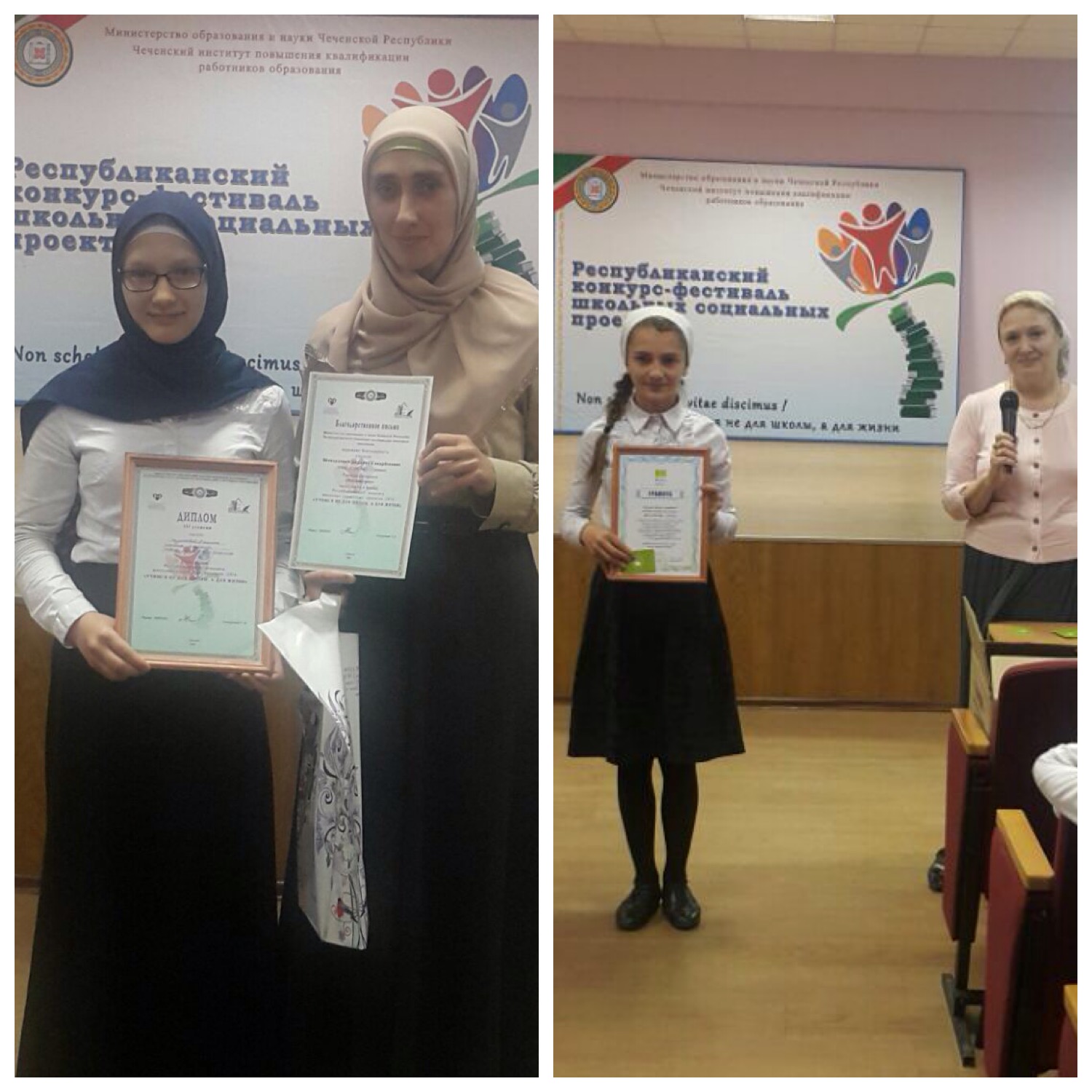 По итогам Республиканского конкурса-фестиваля школьных социальных проектов-2016 в номинации "Учимся не для школы,а для жизни" призовое 3-е место заняла ученица 9 "б" класса Цукаева Залина с проектом "Шаг навстречу".Также сертификат победителей был вручен команде 5 класса МБОУ "СОШ№63" г.Грозного. Поздравляем,ребята!!!Желаем дальнейших успехов!!!