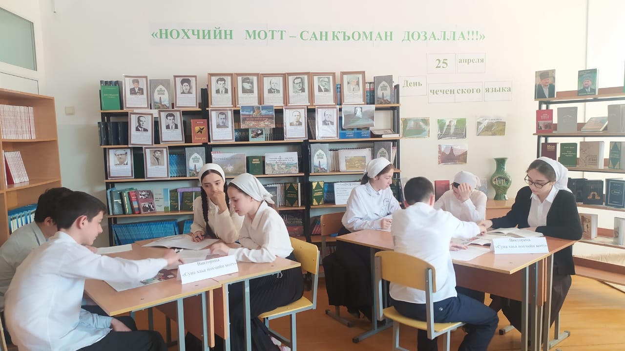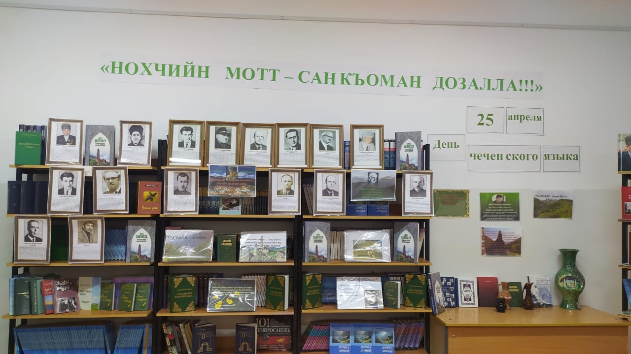 С 20.-25.04.22г.в школьной библиотеке прошла выставка, приуроченная Дню чеченского языка.