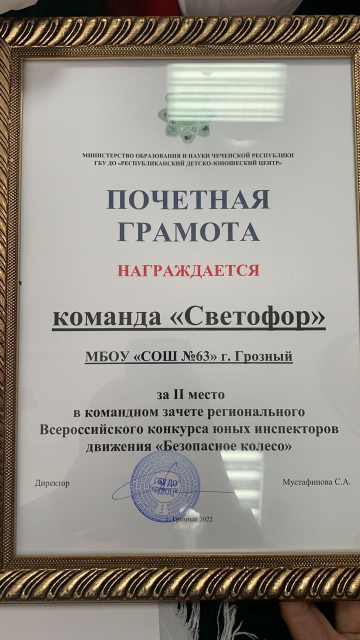 Поздравляем нашу команду "Светофор", которая заняла почетное 2 место в региональном этапе конкурса юных инспекторов движения "Безопасное колесо - 2022"! В состав команды вошли члены школьного отряда ЮИД (Юные Инспектора дорожного Движения): Мажиева Иман, Юнусова Зайнап, Шаипов Билал, Папанов Дени.