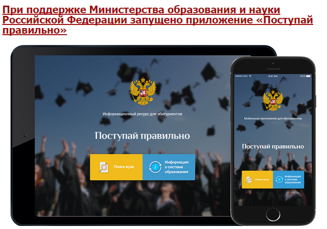 21.06.2017При поддержке Министерства образования и науки Российской Федерации запущено приложение «Поступай правильно». Приложение уже доступно в Google Play и App Store, бесплатно и не содержит рекламы. Новый сервис обеспечит доступ всех желающих к информации о вузах России, которые ведут набор студентов в 2017 году.
