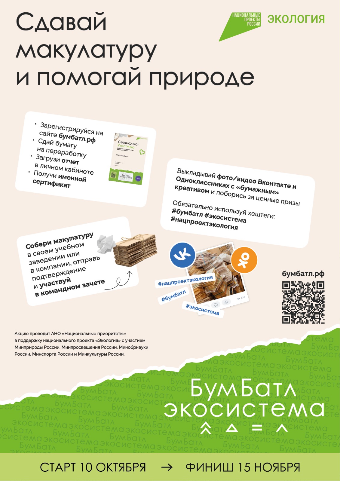 09.11.2023Четвертый сезон акции «БумБатл» стартовал 10 октября. В этом году масштабный экологический проект организован АНО «Национальные приоритеты» совместно с Всероссийским экологическим общественным движением «Экосистема». Ключевая цель акции – сокращение излишнего потребления бумаги, организация системы ее переработки и формирование экологической культуры.