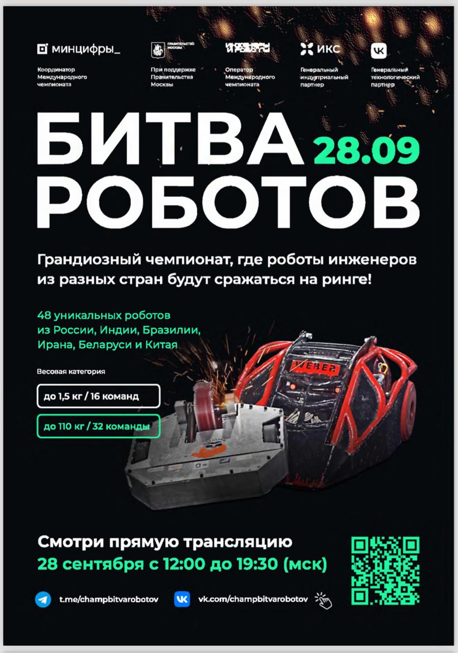 26.09.2024Минцифры России в соответствии с распоряжением Правительства Российской Федерации от 11 апреля 2023 г. No 889-р сообщает о старте нового сезона Международного чемпионата по битве роботов (далее - Чемпионат), который способствует продвижению инженерной мысли как драйвера развития и поддержки современных цифровых технологий.