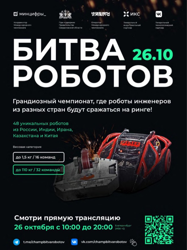 28.10.2024Минцифры России в соответствии с распоряжением Правительства Российской Федерации от 11 апреля 2023 г. № 889-р сообщает о проведении второго отборочного этапа Международного чемпионата по битве роботов , который способствует продвижению инженерной мысли как драйвера развития и поддержки современных цифровых технологий.