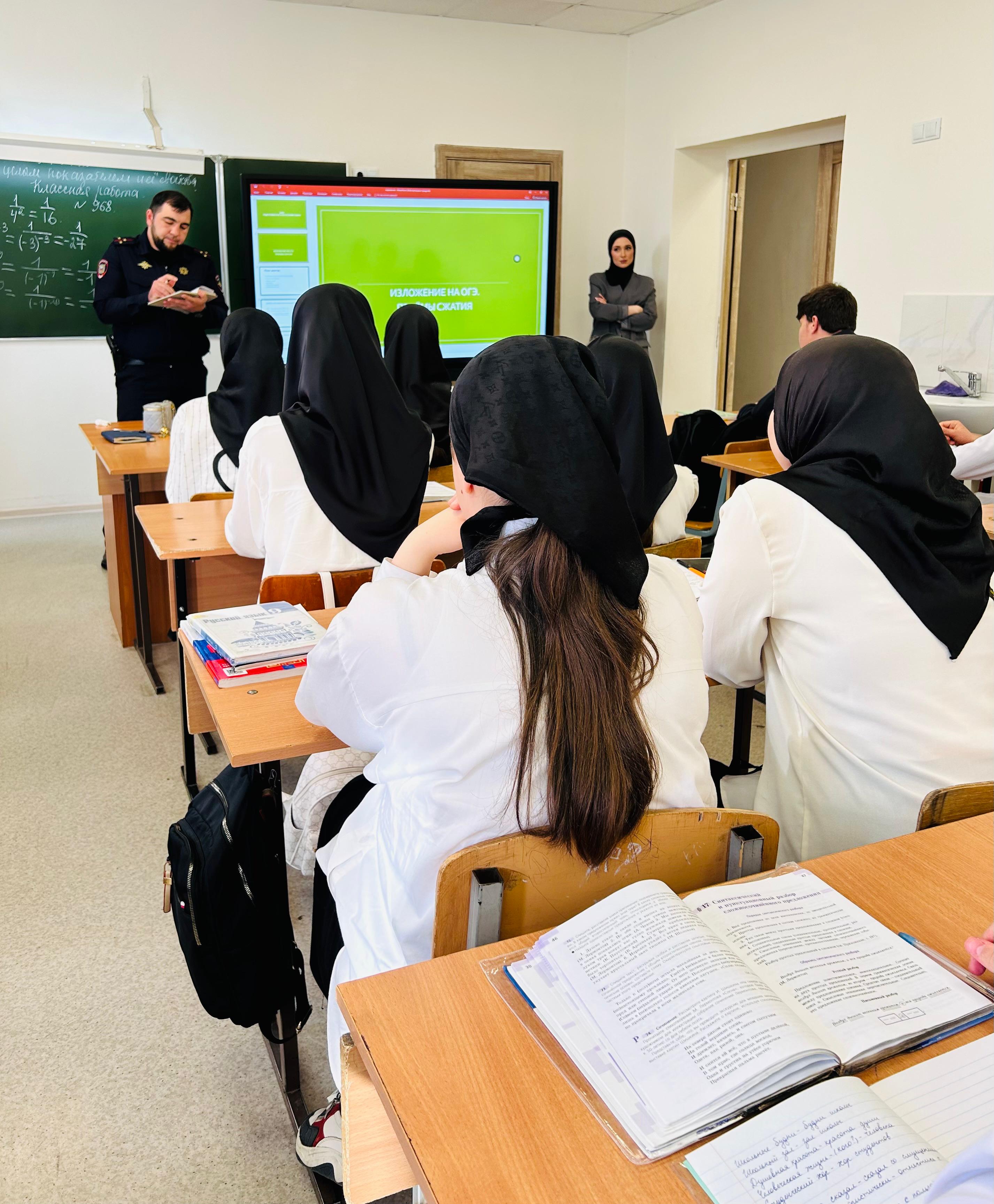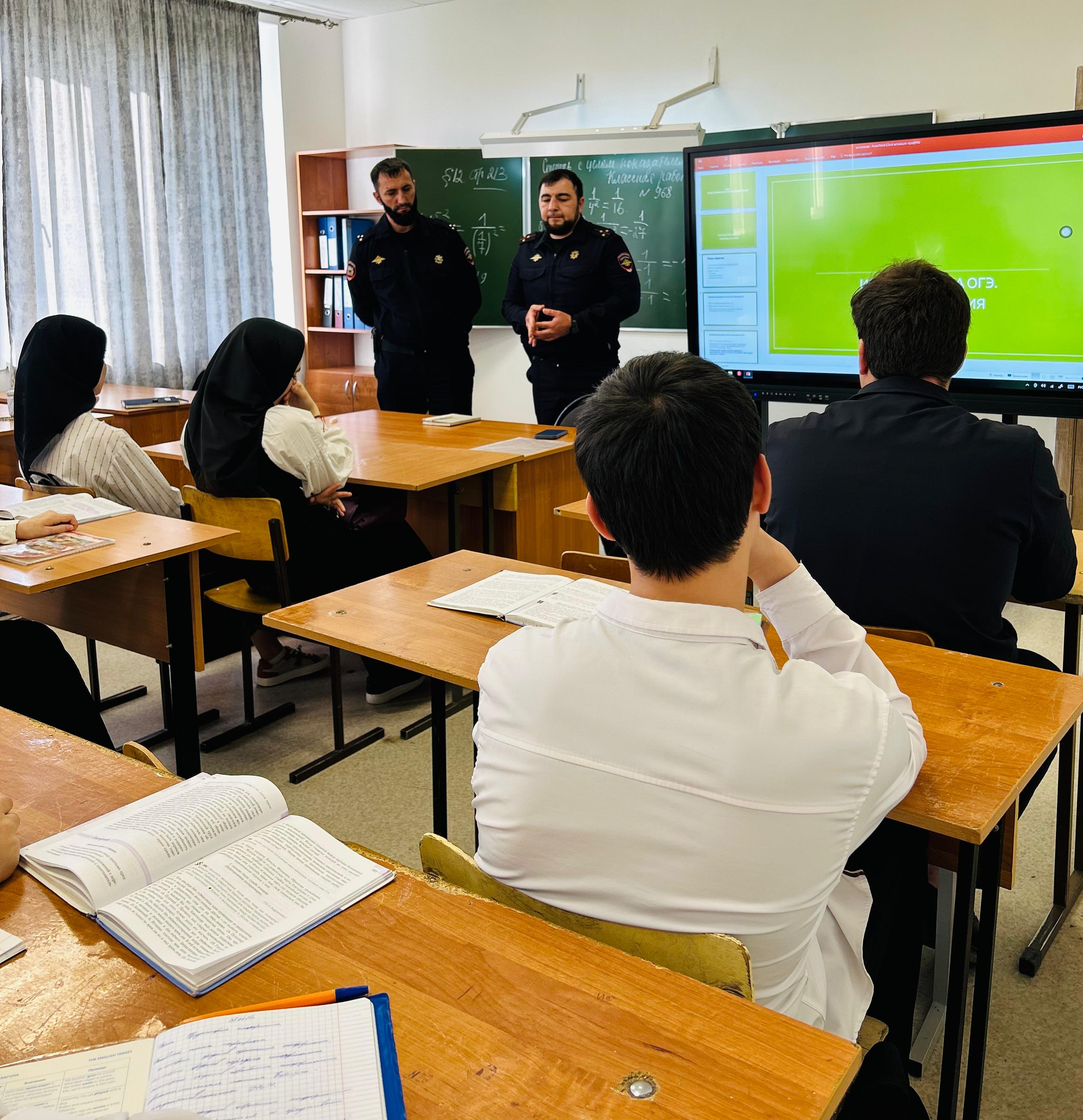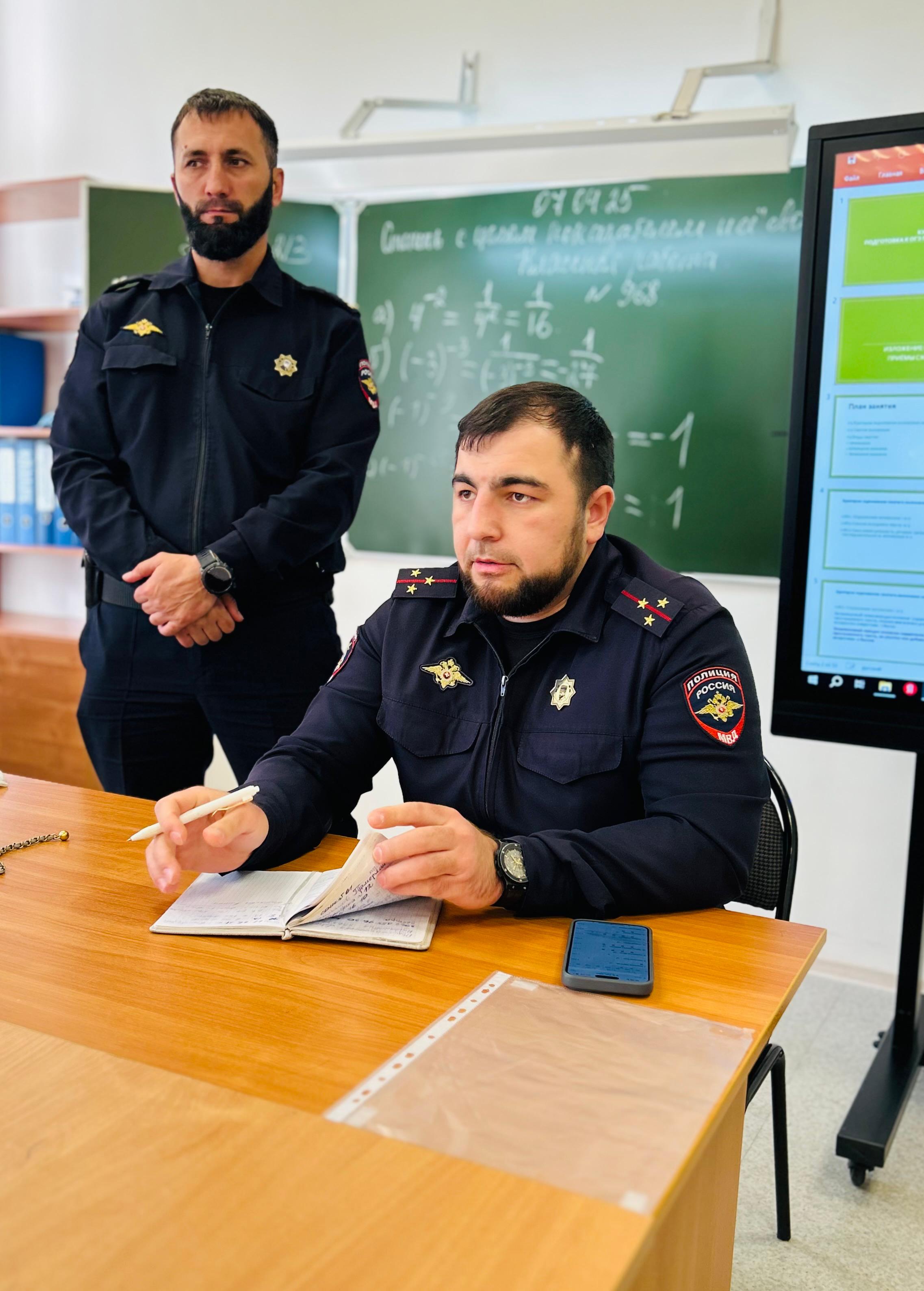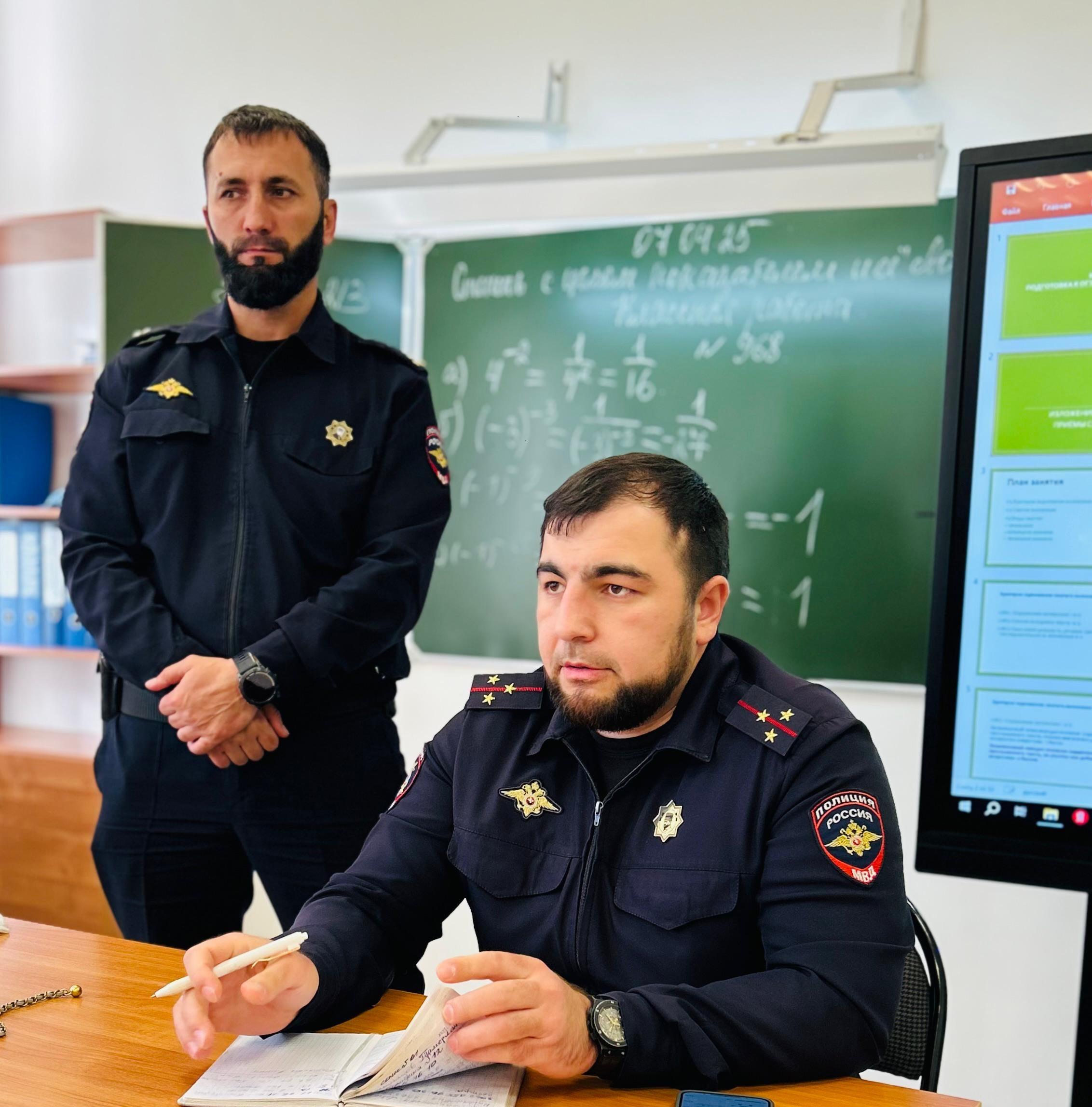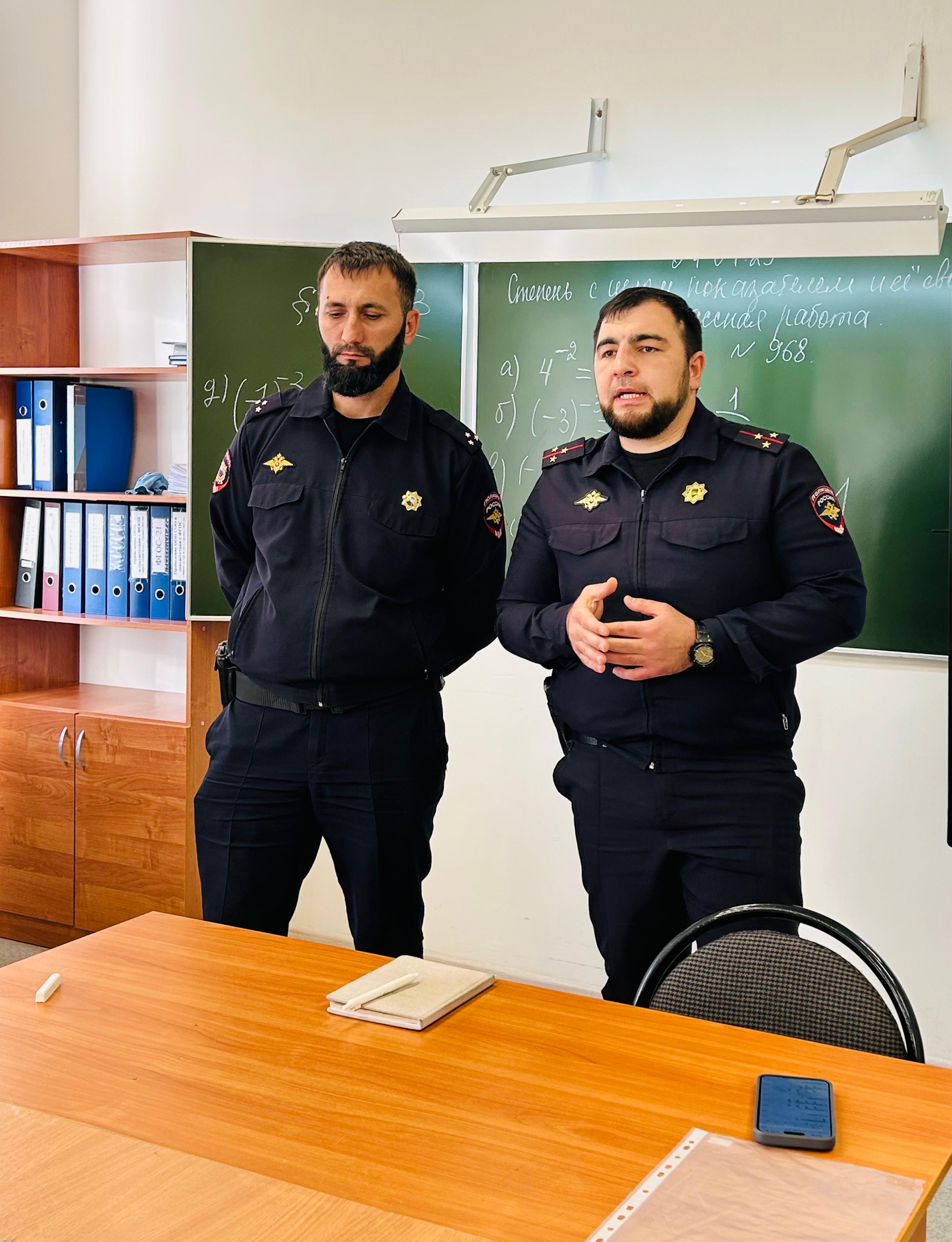 09.04.2025В нашей школе прошла встреча со старшим инспектором ПДН лейтенантом полиции Мусаевым Исламом Магамед-Эмиевичем и старшим лейтенантом полиции Хизириевым Лечи Мовладиевичем. Тема беседы — противодействие терроризму и экстремизму среди молодёжи.