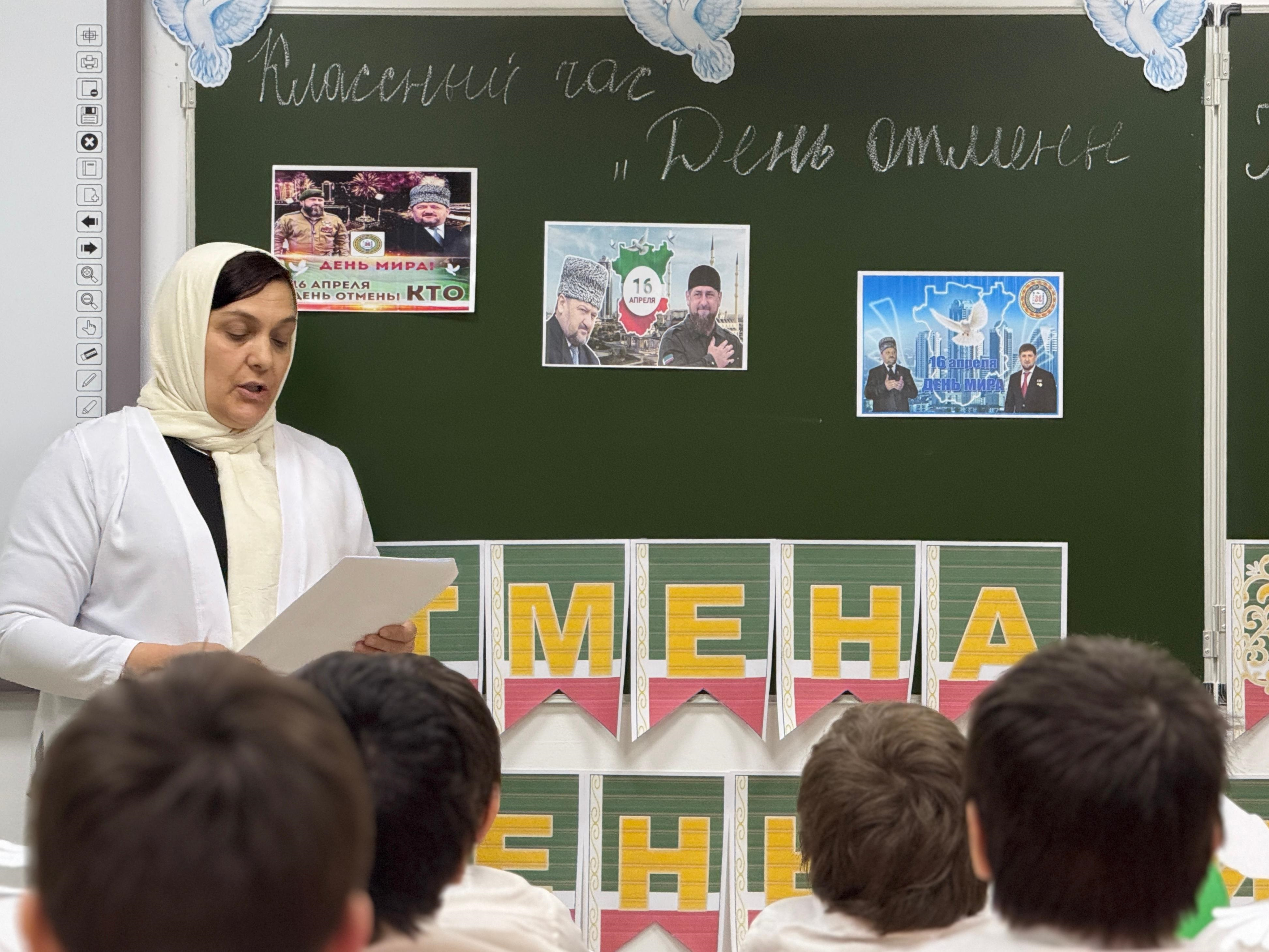 16.04.2025В нашей школе прошли тематические классные часы, посвящённые важной дате – Дню отмены режима контртеррористической операции (КТО) в Чеченской Республике