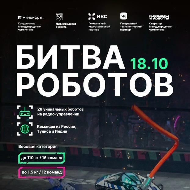 14.10.202518 октября 2025 г. с 11:30 до 19:30 (по местному времени) пройдеттретий отборочный этап Международногочемпионата по битве роботов сезона 2025 года.