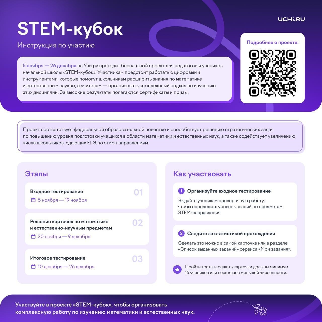 07.11.2025С 5 ноября по 26 декабря включительно на Учи.ру проводится бесплатный соревновательный проект «STEM-кубок» для 1–4 классов.