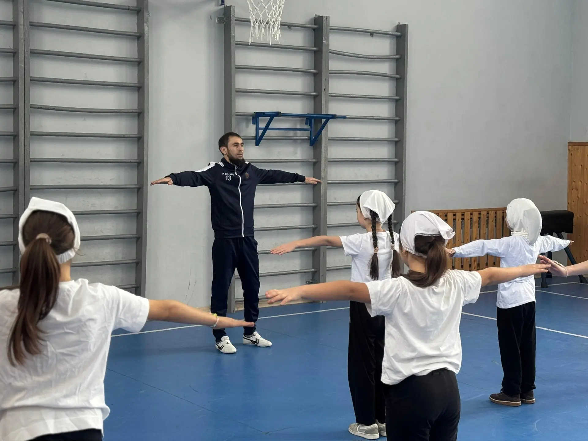 Под руководством чемпиона в школьном спортзале прошла энергичная и захватывающая разминка. Абдурахим Мовсарович показал ребятам не только базовые упражнения для поддержания отличной физической формы, но и элементы специальной разминки спортсменов-единоборцев.