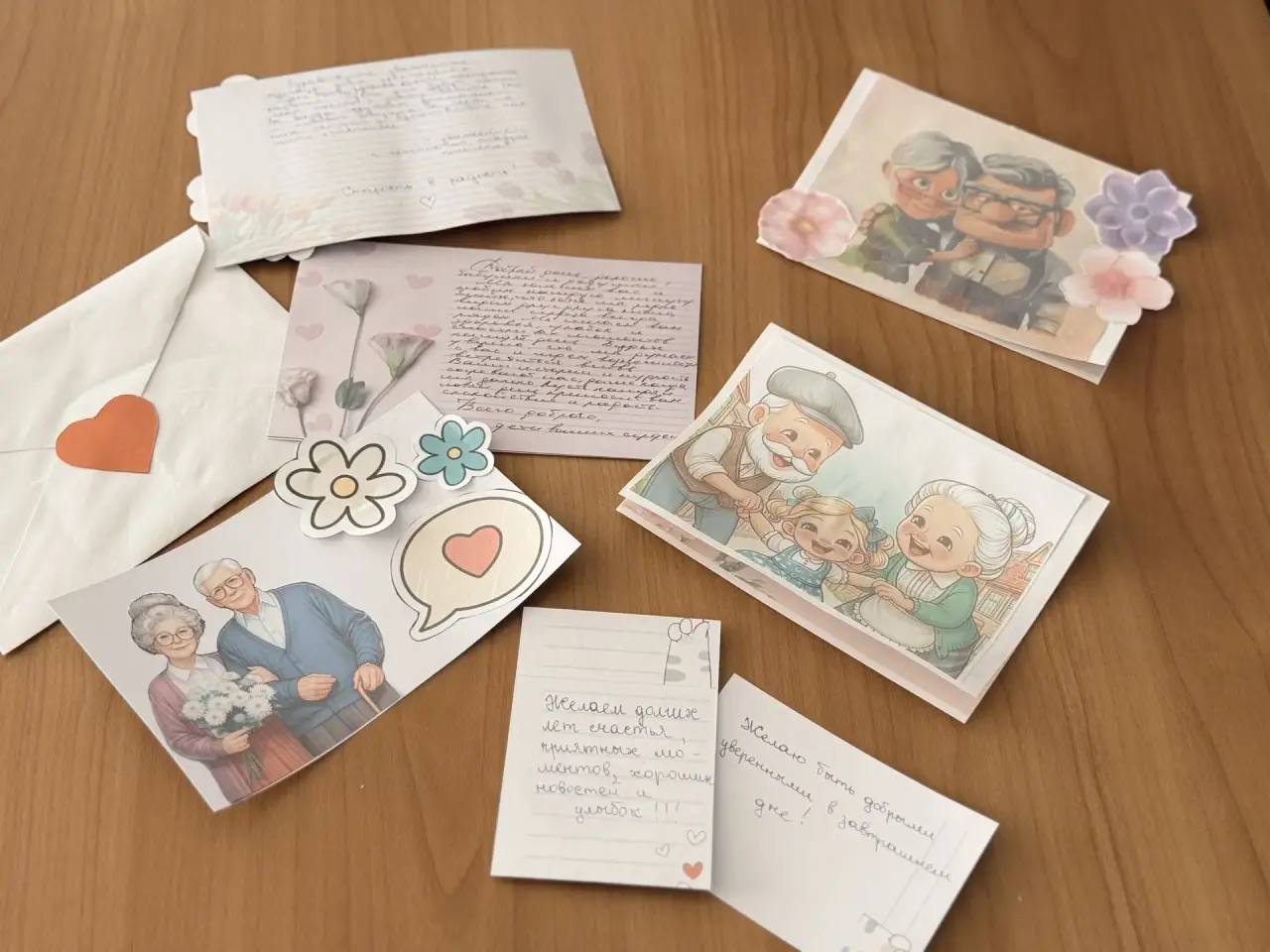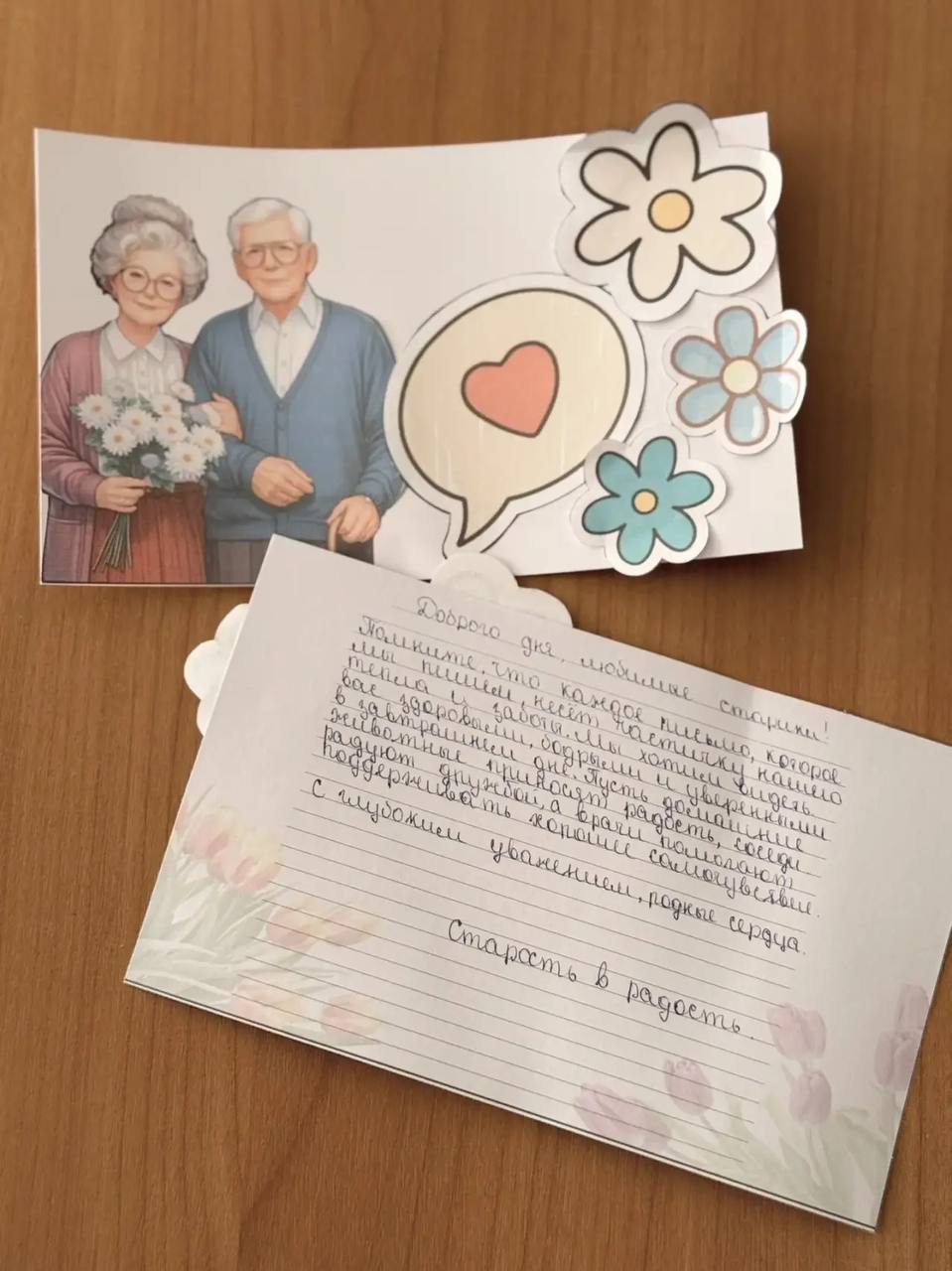 Ребята с особой теплотой и ответственностью подошли к подготовке поздравительных открыток. В своих работах они постарались передать искренние слова поддержки, пожелания здоровья, бодрости, оптимизма и хорошего настроения. Каждая открытка была оформлена аккуратно и с душой, ведь важно, чтобы она действительно принесла радость своему адресату.