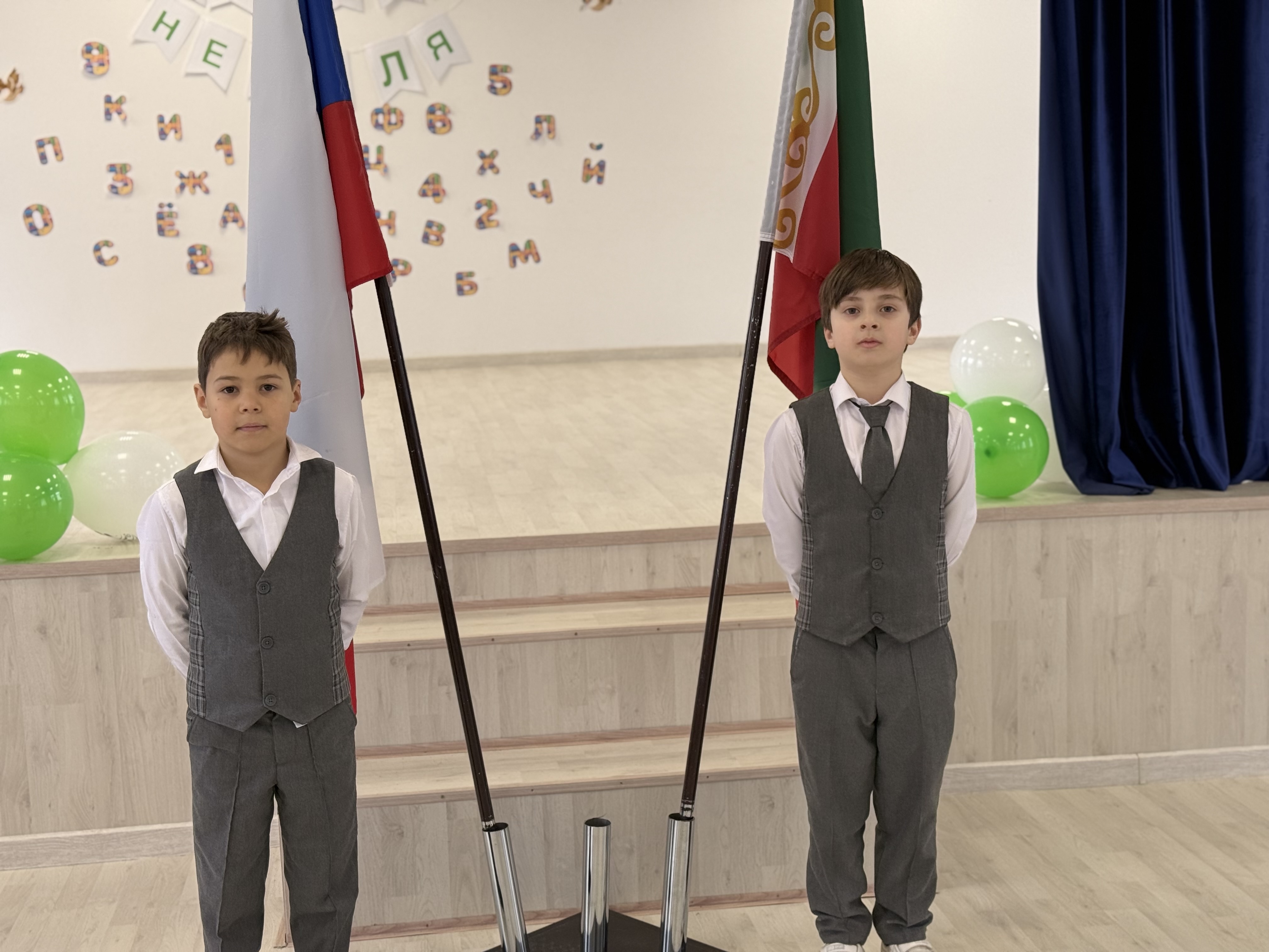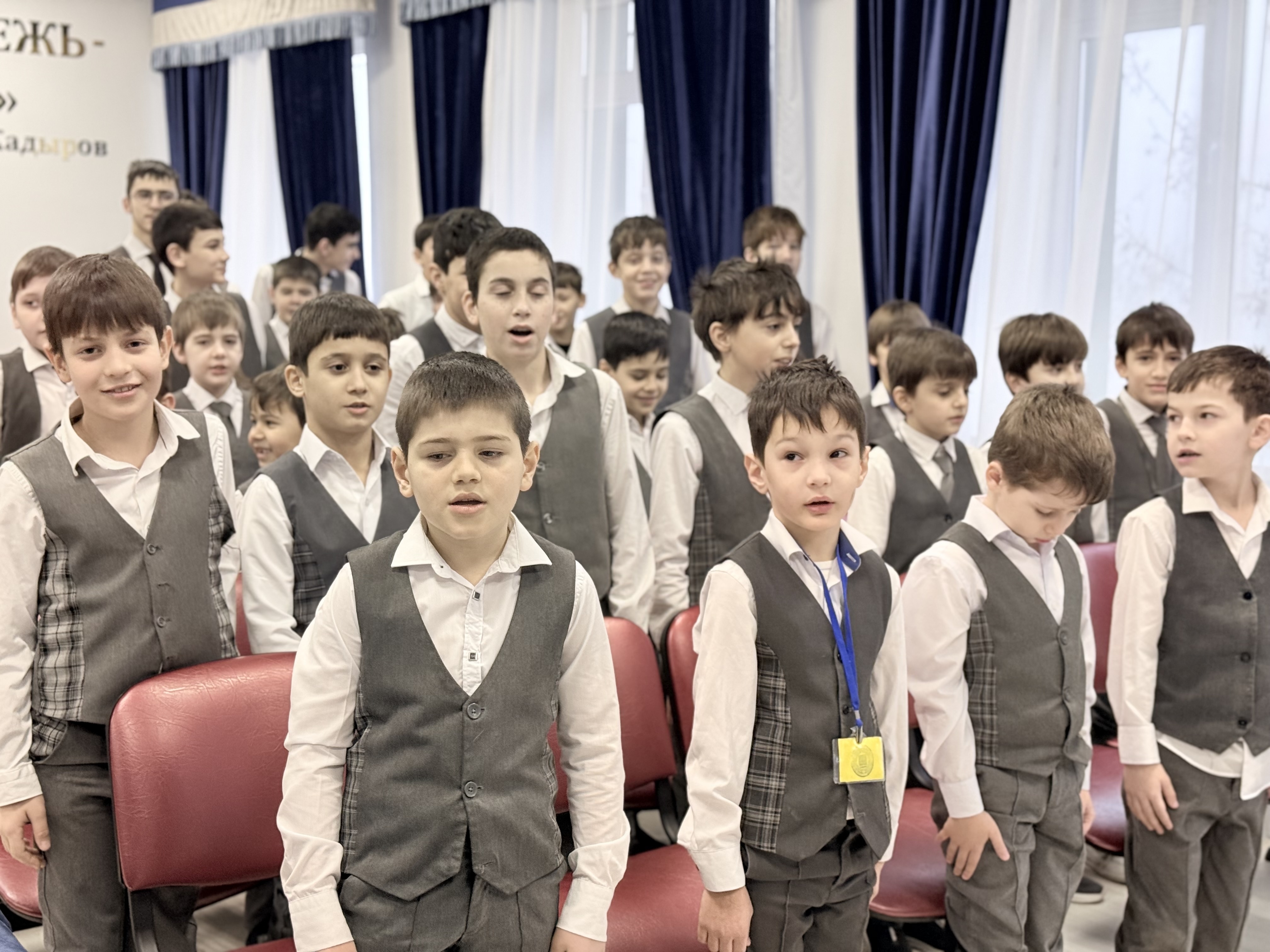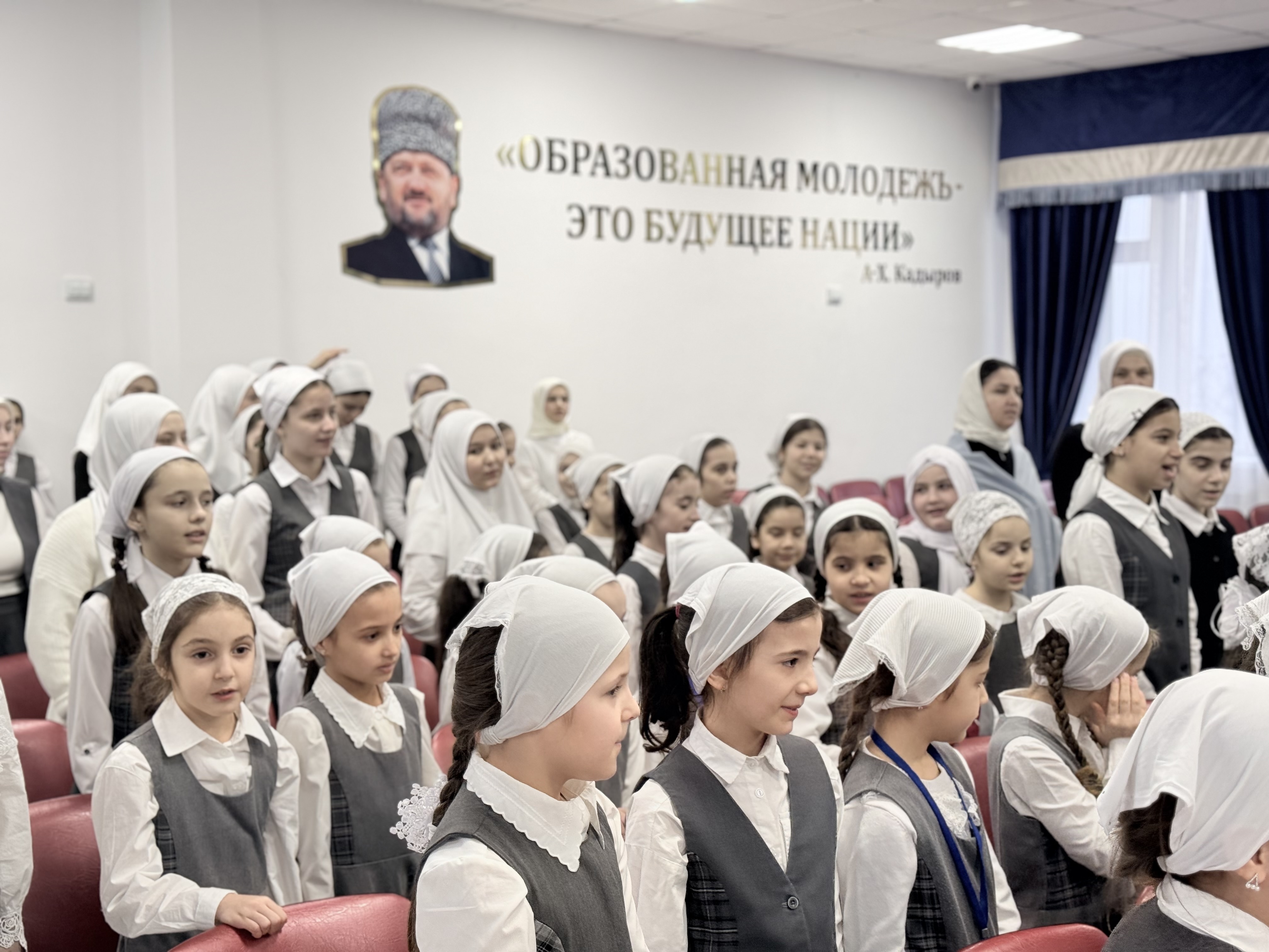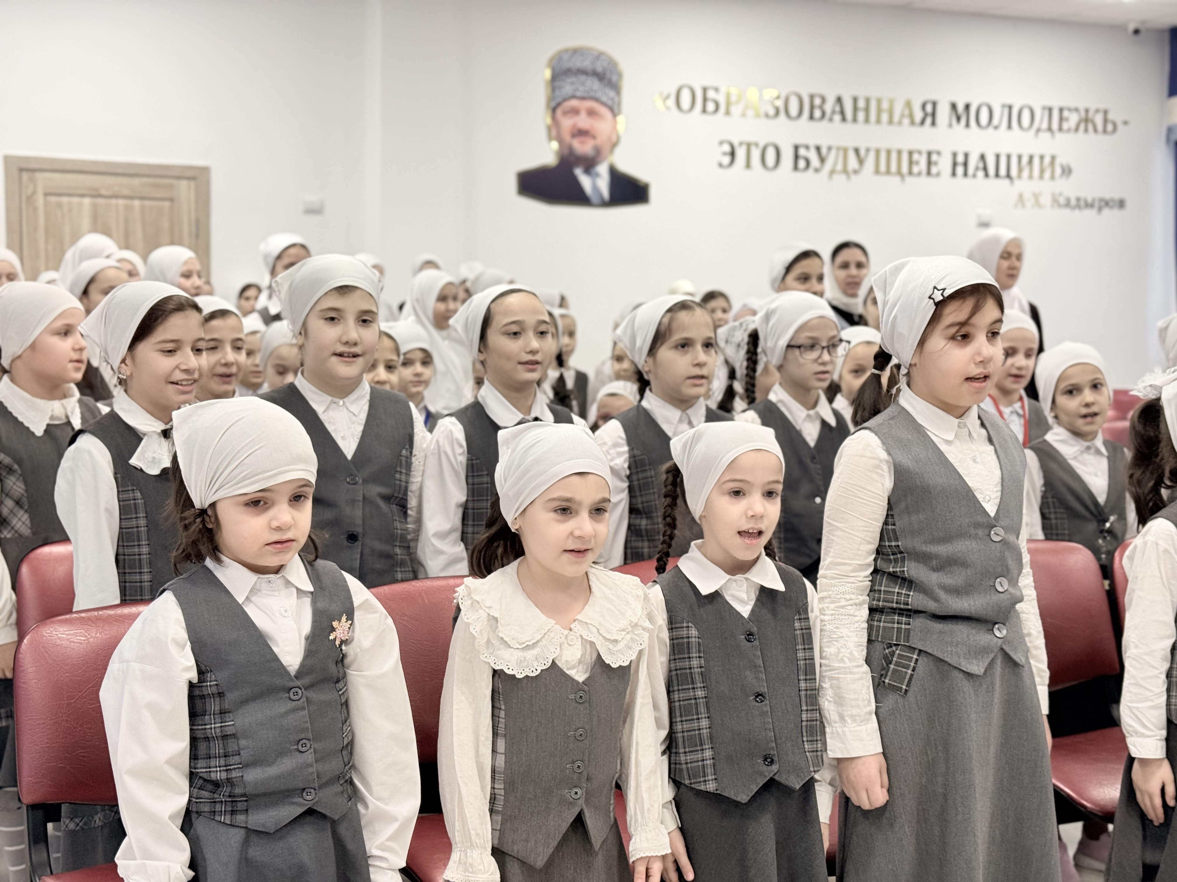 Под звуки гимнов Российской Федерации и Чеченской Республики актовый зал наполнился особой атмосферой уважения, единства и гордости. Обучающиеся и педагоги выстроились, чтобы вместе отдать дань государственным символам — символам силы, истории и будущего нашей страны и республики.