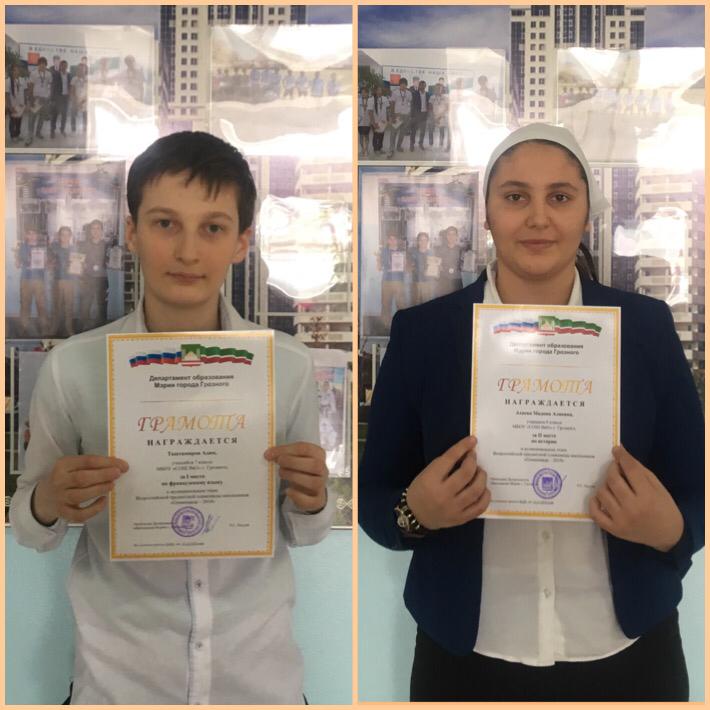 07.02.2019Поздравляем наших победителей и призеров муниципального этапа Всероссийской олимпиады школьников: учащегося 8 класса Таштамирова Адама, занявшего 1 место по французскому языку; учащуюся 8 класса Ахаеву Мадину, занявшую 2 место по истории. Поздравляем с заслуженной победой! Мы уверены, что опыт участия в этой олимпиаде вас многому научил. Никогда не останавливайтесь на достигнутом – учитесь, узнавайте новое, развивайтесь. Успехов вам, вдохновения, творчества и позитива каждый день!